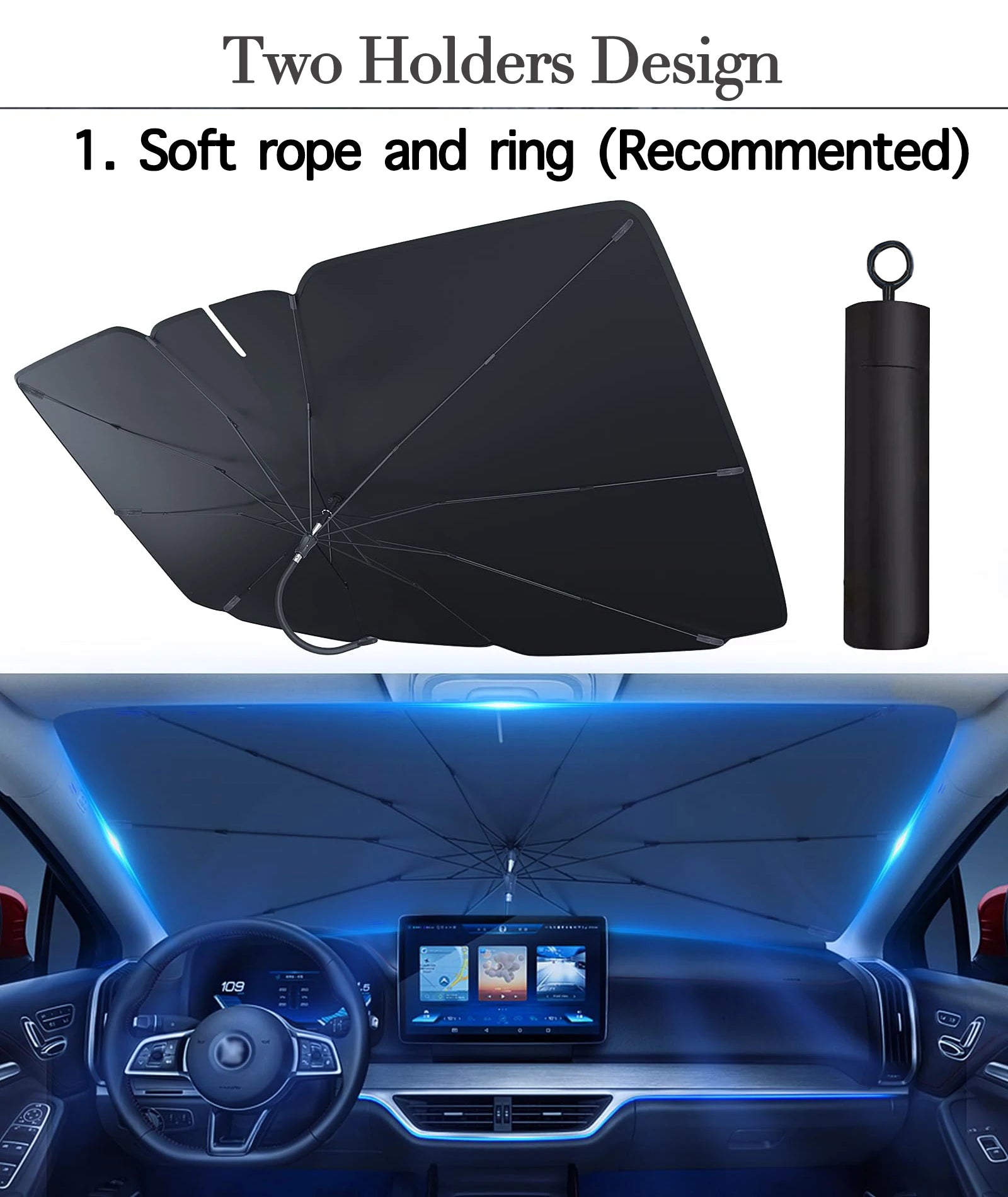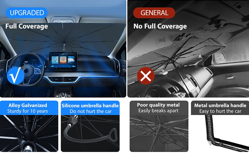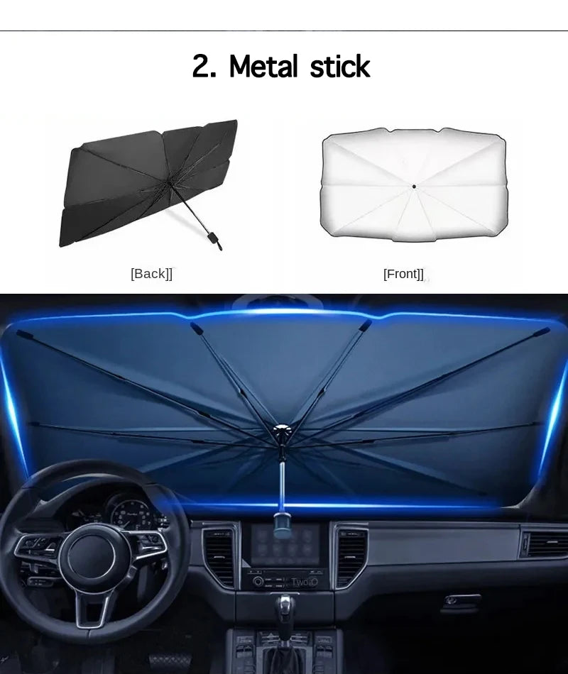 Features: High-quality foldable sunshade made from durable materials to block UV rays and reflect heat. The umbrella design allows easy opening, folding, and compact storage.